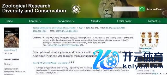 近期,《Zoological Research: Diversity and Conservation》杂志发表了一篇西双版纳植物园蜘蛛分类究诘论文开云kaiyun下载官网手机版,其中包含园蛛科6个新属16个新种,16个新种的名字一谈来自周杰伦的歌曲,分裂是:安静艾蛛、倒带艾蛛、龙拳艾蛛、星晴艾蛛、花海桂王人蛛、漂移新园蛛、屋顶新园蛛、好天彭园蛛、外婆锥头蛛、借口宋园蛛、退后宋园蛛、搁浅唐园蛛、夜曲王园蛛、暗号尹园蛛、彩虹尹园蛛、稻香朱园蛛。